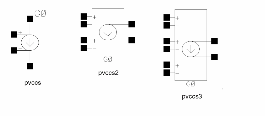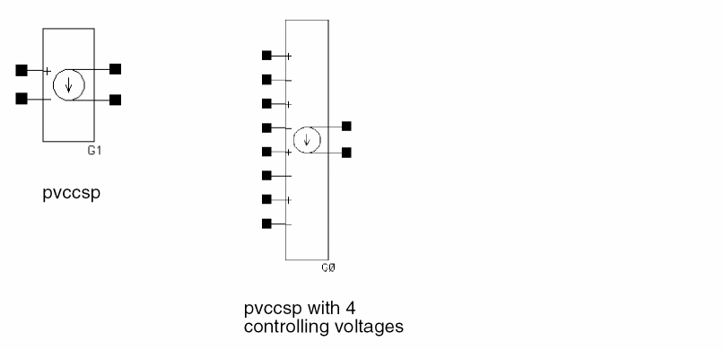 pvccsp is a Pcell-based polynomial voltage controlled current source in which the symbol varies with the number of controlling voltages. pvccsp is similar to pvccs except that it has one additional parameter (nc) that specifies the number of controlling voltage sources.