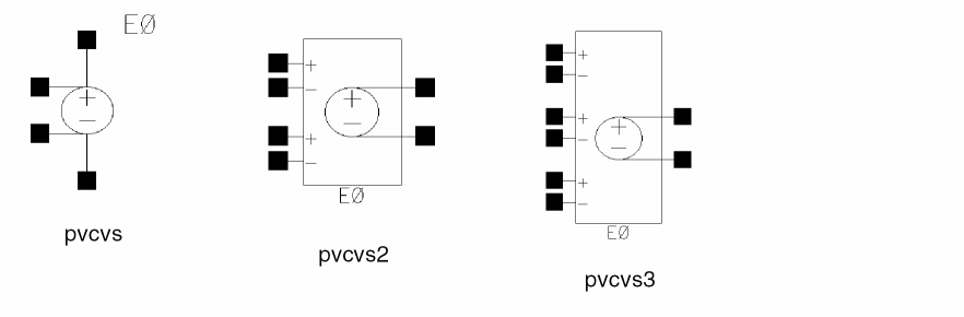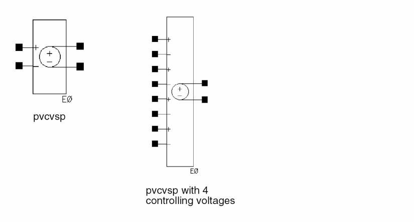 pvcvsp is a Pcell-based polynomial voltage controlled voltage source in which the symbol varies with the number of controlling voltages. This component is similar to pvcvs except that it has one additional parameter (nc) that specifies the number of the controlling voltage sources.