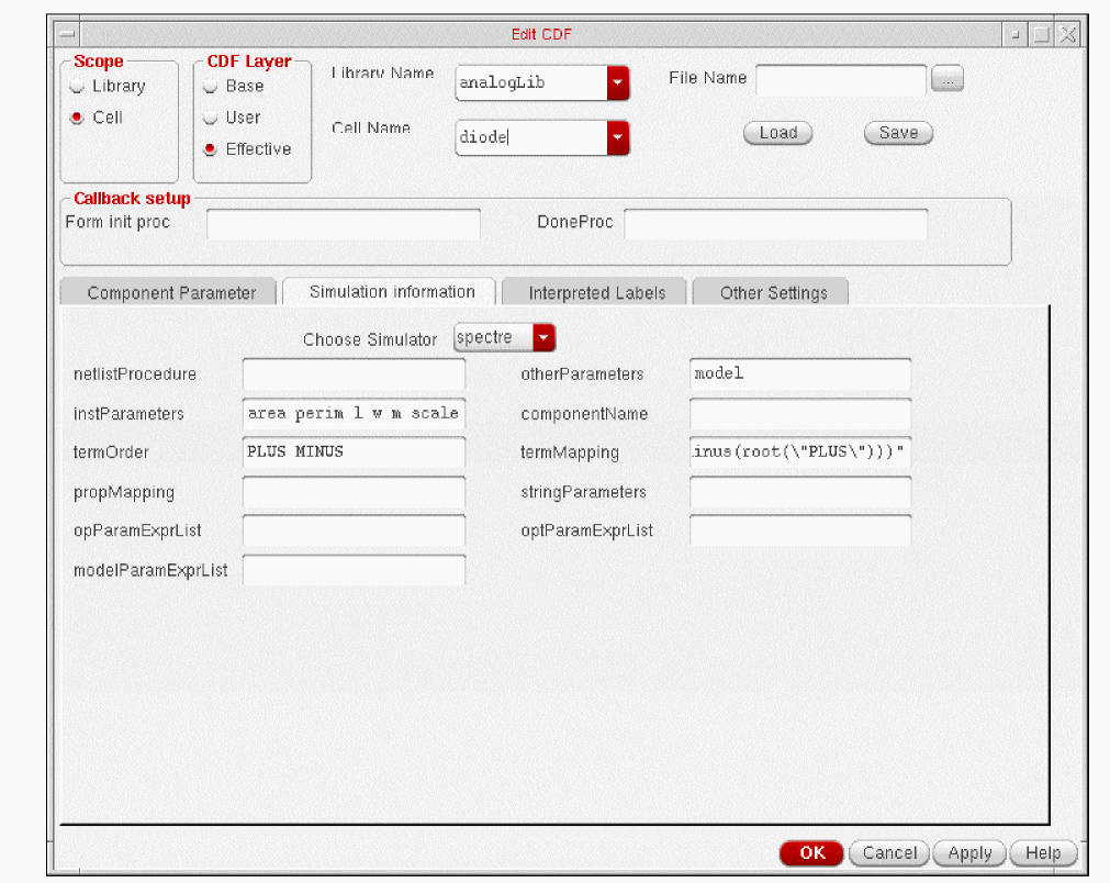 Each component may be supported by different simulators, such as spectre or auCdl. The simulators supported in the Cadence Analog Design Environment are: