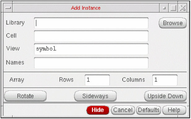 In the Add Instance form, notice that the library, cell, and view names appear in the Library, Cell, and View fields. The parameters for the selected component are also displayed.