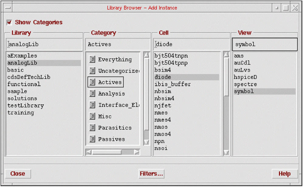 analogLib,Actives, anddiodefrom the Library, Category, and Cell list boxes respectively.