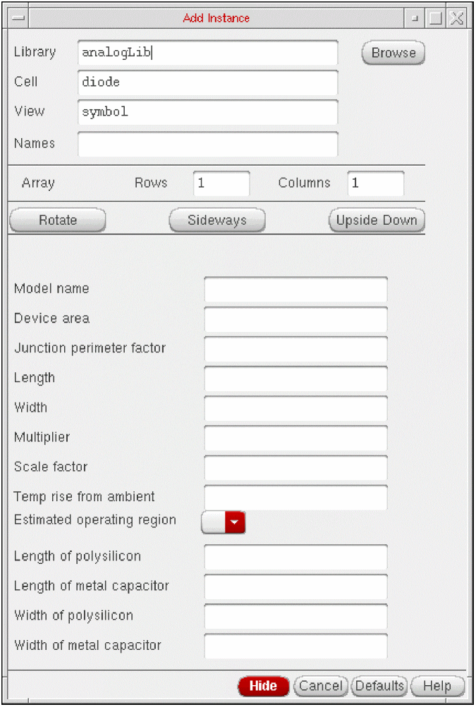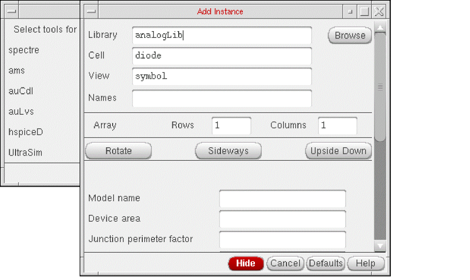 Notice that the list of parameters in the Add Instance form changes to display only those parameters that are applicable for Spectre for the diode component.