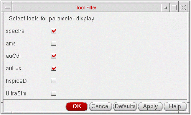 Select Options->Tool Filter from the Virtuoso Schematic Editing window. The Tool Filter form appears.