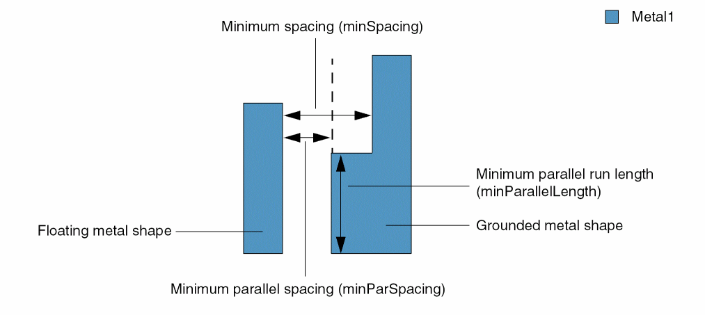 where, minSpacing is the minimum spacing, minParSpacing is the minimum parallel spacing, and parallelLength is the minimum parallel run length, as shown in the figure above.