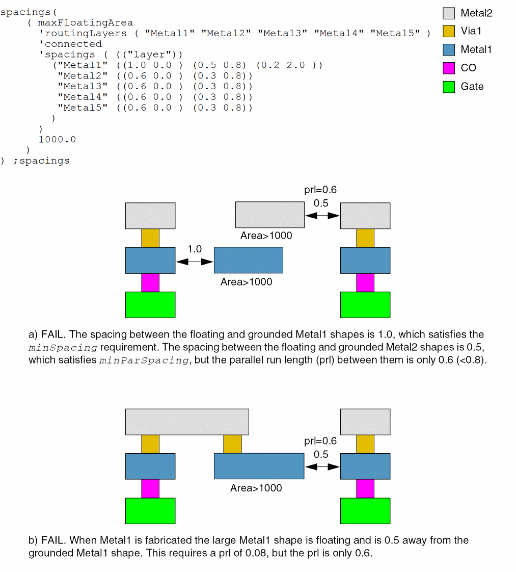 The floating metal shapes that are at a distance greater than or equal to minParSpacing from grounded metal shapes must have parallel run length greater than or equal to parallelLength at the minimum spacing distance.