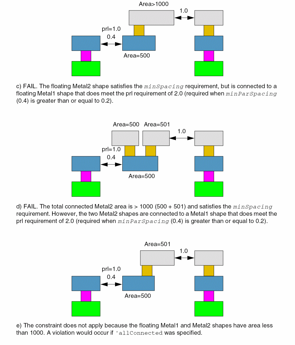 'connected: The constraint applies to the sum of the areas of the connected floating metal shapes on each specified routing layer. The connected area on a layer must be less than or equal to area, or meet the minimum spacing requirements between the floating and grounded metal shapes. -
