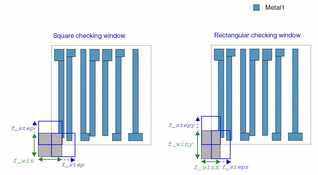 Density constraints are usually represented in two ways. They can apply either across the area of the whole design or specifically to the region covered by the checking window, which is moved incrementally across the design to check for localized problems.