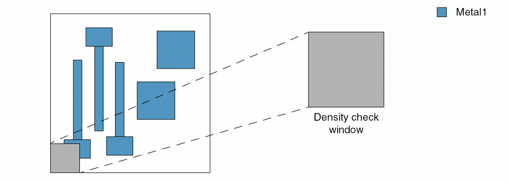 Density constraints are usually represented in two ways. They can apply either across the area of the whole design or specifically to the region covered by the checking window, which is moved incrementally across the design to check for localized problems.