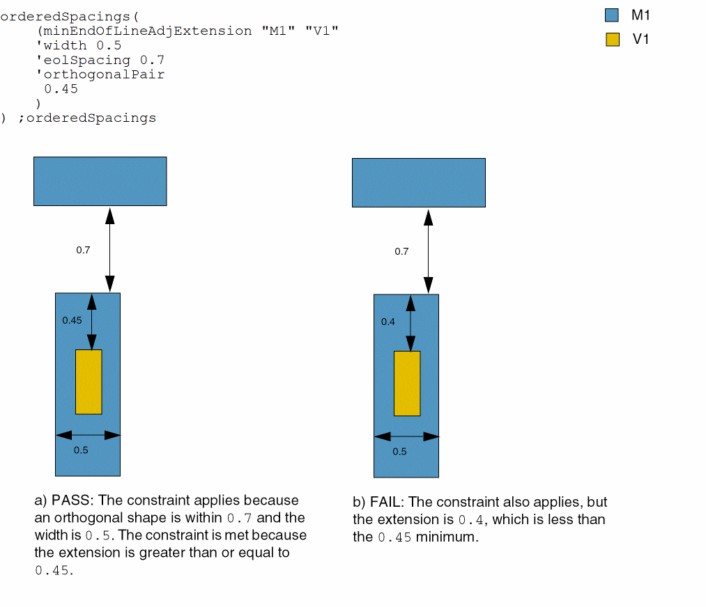 This example specifies the required extension of M1 over V1 to be 0.45 when another M1 shape is present within 0.7 of the end-of-line edge in the orthogonal routing direction when the enclosing shape has a width of less than or equal to 0.5.