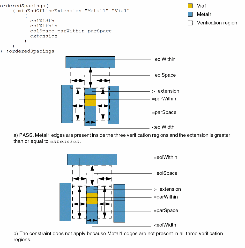 These two parameters together define a verification region that extends beyond and on both sides of the end-of-line edge up to a distance equal to eolSpace and eolWithin, respectively. The constraint applies only if a layer1 neighboring edge is present inside this verification region (and inside the verification regions defined by parWithin and parSpace).