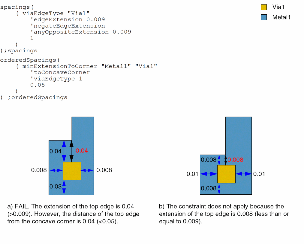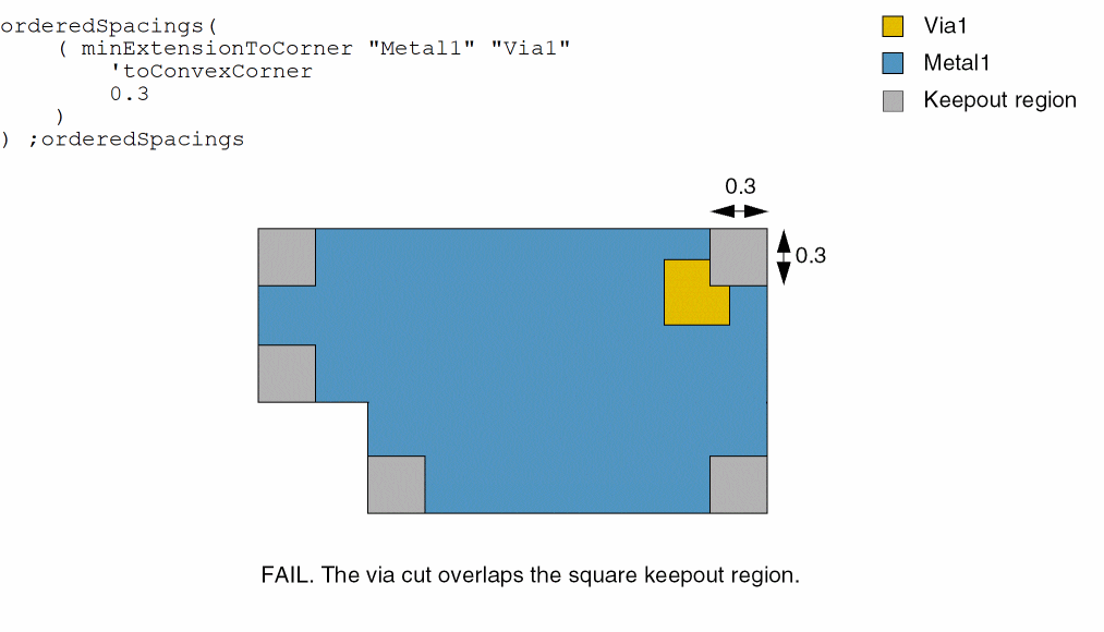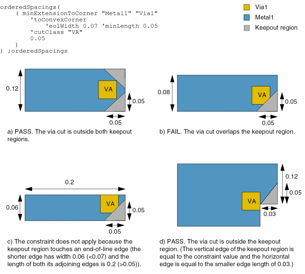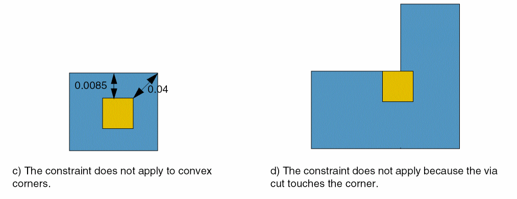 For convex corners, the constraint value is used to define a keepout region that the layer2 shape must not overlap. This keepout region can be a triangle or a square depending on whether the 'eolWidth parameter is specified.