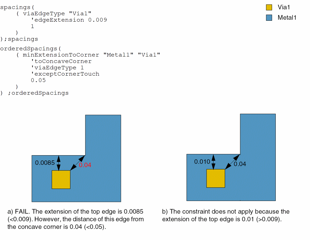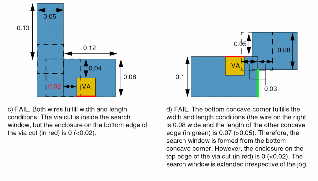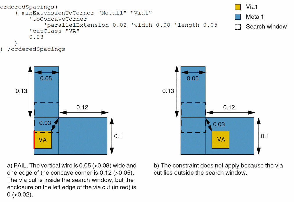 - The via cut lies inside a search window that is formed by extending the concave corner by 0.03 (the constraint value) on both sides in the direction that is perpendicular to the edge with width less than or equal to 0.08.