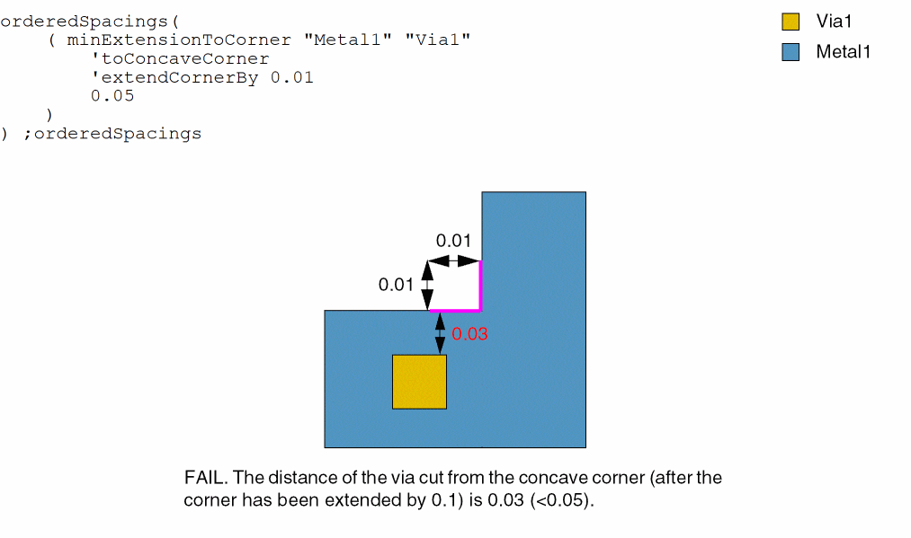 The distance of a Via1 via cut from a concave corner of an enclosing Metal1 shape must be at least 0.05. The spacing is checked after extending the concave corner by 0.01 in both directions.