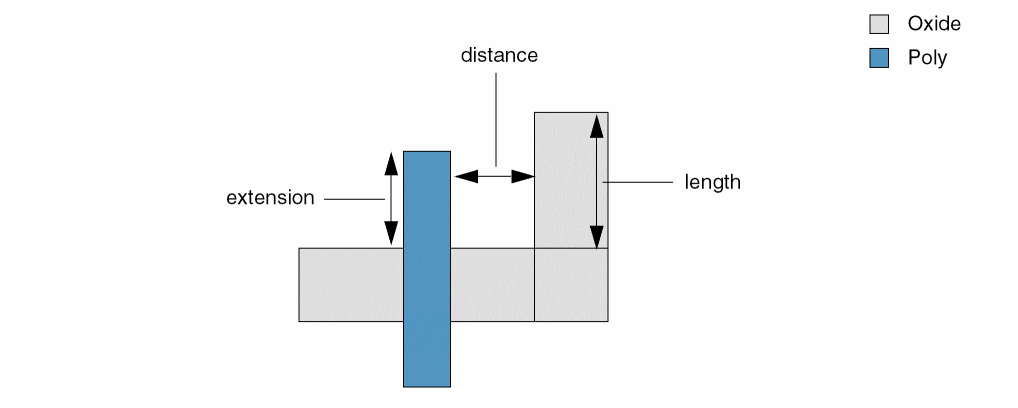 Specifies the minimum poly extension for a gate when an L-shaped oxide shape is at a distance less than or equal to distance from the poly shape. The constraint applies only if the length of the jog is greater than length.