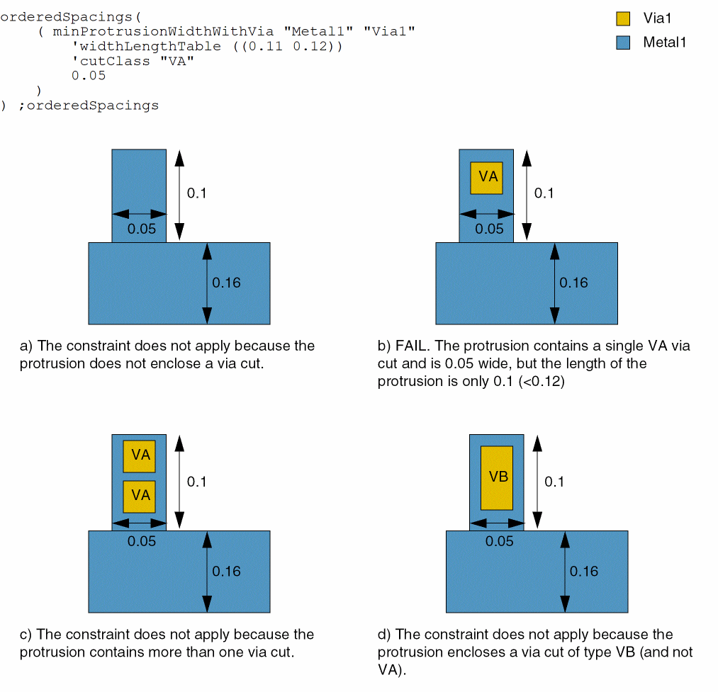 If the protrusion on a wide Metal1 wire contains a single via cut of type VA on Via1, the following conditions must be met: