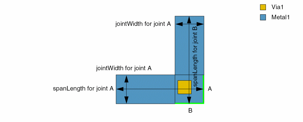 If joint width is less than 0.15 and span length is greater than 0.1, the extension of one of the joint edges (Metal1) must be greater than or equal to 0.05 or the extension of both joint edges must be greater than or equal to 0.03.