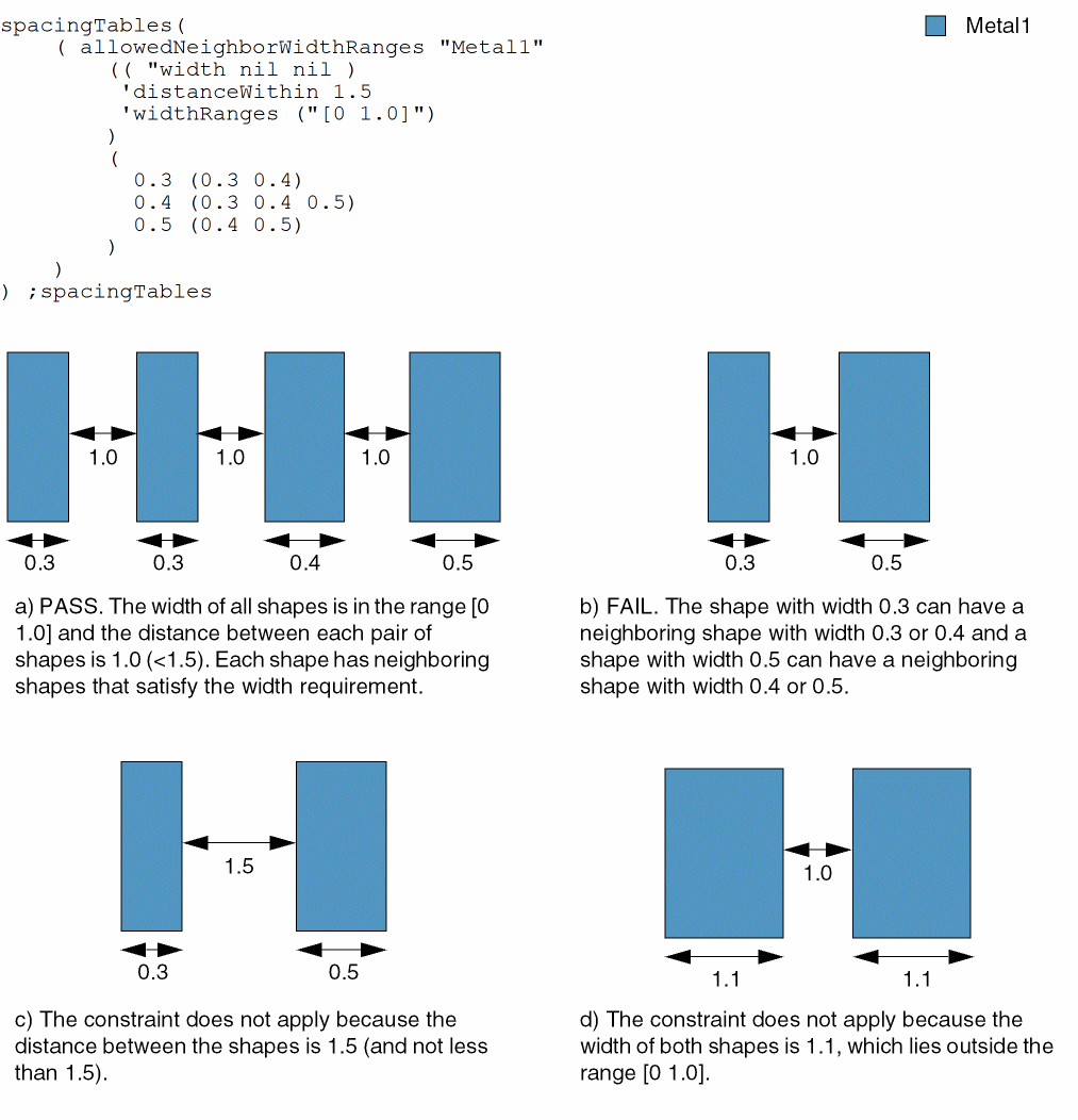 spacingTables( ( allowedNeighborWidthRangestx_layer(( "width" nil nil ) 'distanceWithinf_within['widthRanges (g_widthRanges)] ['insideLayers (tx_layer1tx_layer2…tx_layerN) ['insidePurposes (t_purpose1t_purpose2…t_purposeN)] | 'outsideLayers (tx_layer1tx_layer2…tx_layerN) ['outsidePurposes (t_purpose1t_purpose2…t_purposeN)] ] [f_default] ) (g_table) )