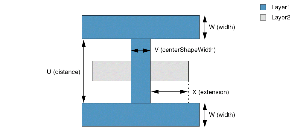 Specifies that shapes connected to form an H-shaped pattern on the same layer (layer1) cause a violation if any of the following conditions is true: