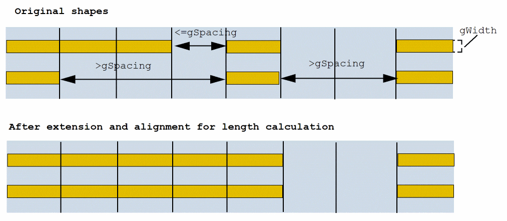 Specifies that if shapes on the upper and lower edges within a cell row have width equal to g_width, the shapes are extended and aligned. In addition, any gap on the same edge that is less than or equal to g_spacing is filled and merged while calculating the length.