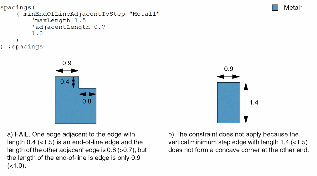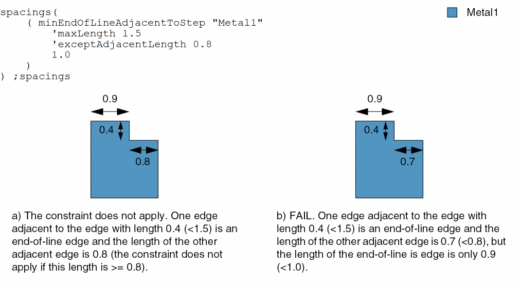 The length of an end-of-line edge must be greater than or equal to 1.0 if it is adjacent to an edge with length less than 1.5. The constraint does not apply if the minimum step edge forms a concave corner with an edge with length greater than or equal to 0.8 at the other end.