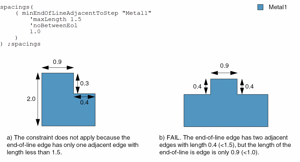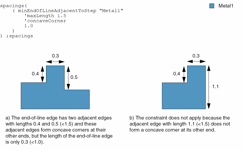 spacings( ( minEndOfLineAdjacentToSteptx_layer'maxLengthf_maxLength['exceptAdjacentLengthf_exceptAdjacentLength| 'adjacentLengthf_adjacentLength| 'noBetweenEol ] ['concaveCorner]f_length)