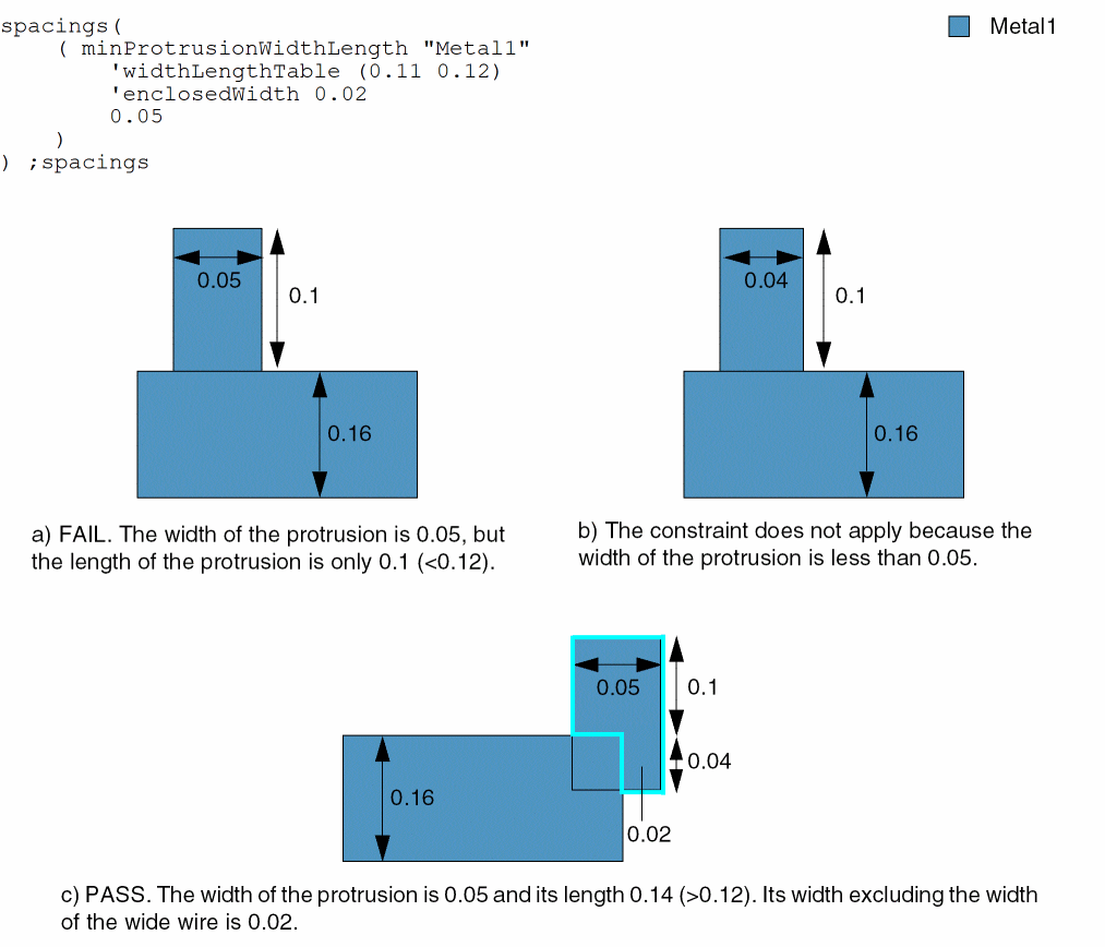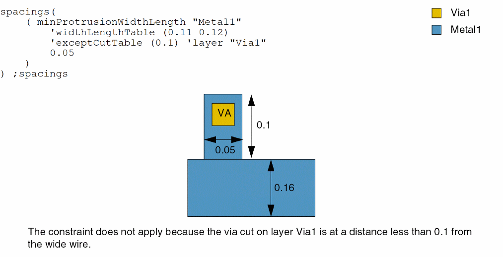 spacings( ( minProtrusionWidthLengthtx_layer'widthLengthTable ((f_wideWidthf_length) …) ['enclosedWidthf_enclWidth| ['exceptCutTable (l_distance) ['layertx_cutLayer] ]f_width)
