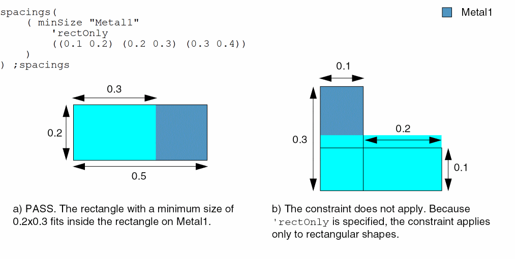 minArea and minSize constraints are set on a layer, both constraints are satisfied if either constraint is met.