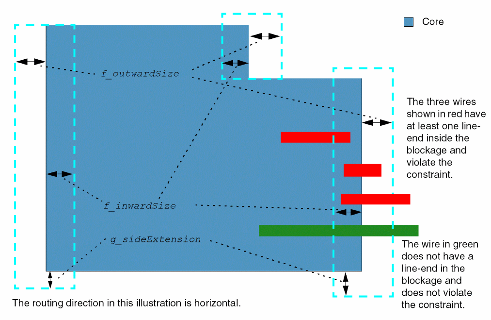 (Virtuoso Layout Suite EXL and higher tiers) Specifies the size and direction of end-of-line blockages from core edges. Wires starting in the core interior and ending with an end-of-line edge in the blockage violate the constraint. On the other hand, wires with no end-of-line edge in the blockage or those that start in the edge but end in the blockage do not violate the constraint.