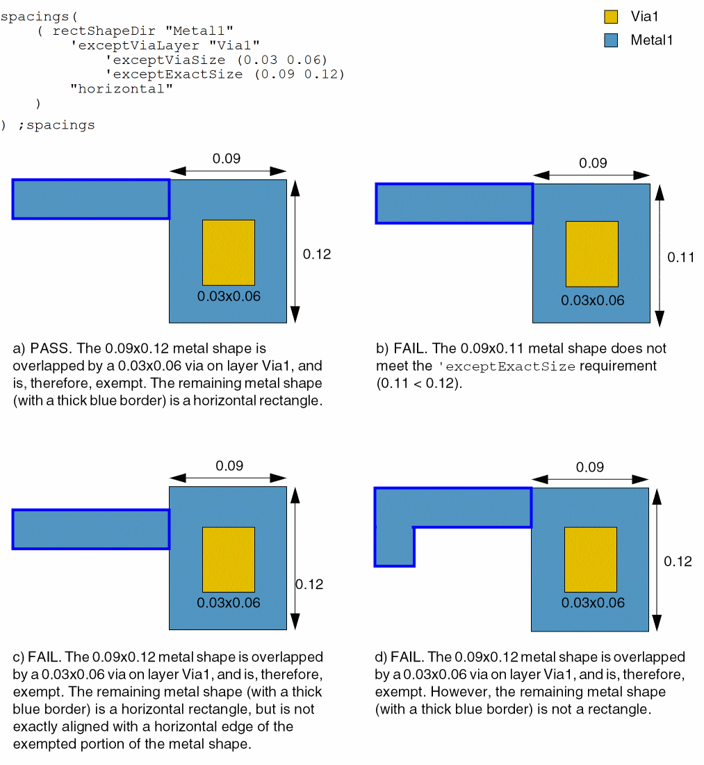 (Virtuoso Advanced Node for Layout Standard) The constraint does not apply to a metal shape with dimensions exactMetalSize1 and exactMetalSize2 if a via with dimensions viaSize1 and viaSize2 placed on viaLayer overlaps it. The metal shape left after subtracting such a shape must either be a rectangle or multiple exactly aligned rectangles. Moreover, this exemption applies only if an edge of this metal shape in the direction of the constraint is exactly aligned with an edge of such rectangles.