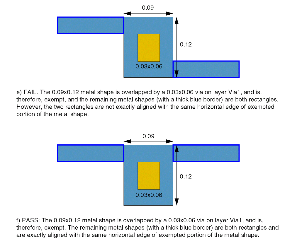A Metal1 shape with dimensions 0.09x0.12 is overlapped by a 0.3x0.06 via. The constraint is met if the remaining portion of the metal shape is a horizontal rectangle, exactly aligned with a horizontal edge of the exempted portion of the metal shape.