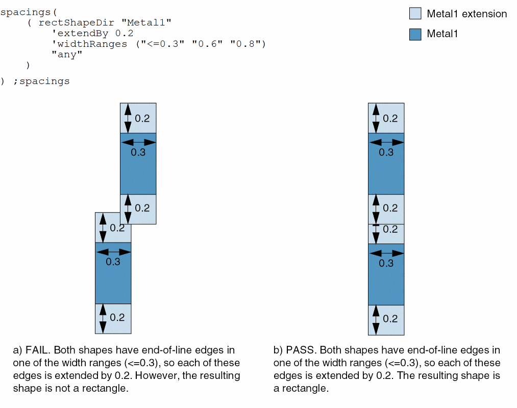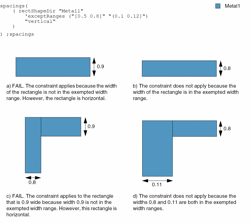 spacingTables( ( rectShapeDirtx_layer(( "width" nil nil ) ['extendByf_extendBy['widthRanges (g_ranges)]] [['exceptViaLayertx_viaLayer'exceptViaSize (f_viaSize1f_viaSize2) 'exceptExactSize (f_exactMetalSize1f_exactMetalSize2) |'exceptViaEdgeAligned |'exceptVia ] ] ['exceptEdgeLengthf_maxLength'widthf_maxWidth['twoSides]] ['exceptRanges (g_exceptRanges)] ['exceptNonCorePins] ['exceptWidthf_width{'widthHorizontal |'widthVertical}] ['partialTracks] ['onlyOne] [ "any" | "horizontal" | "vertical" ] ) (g_table) )