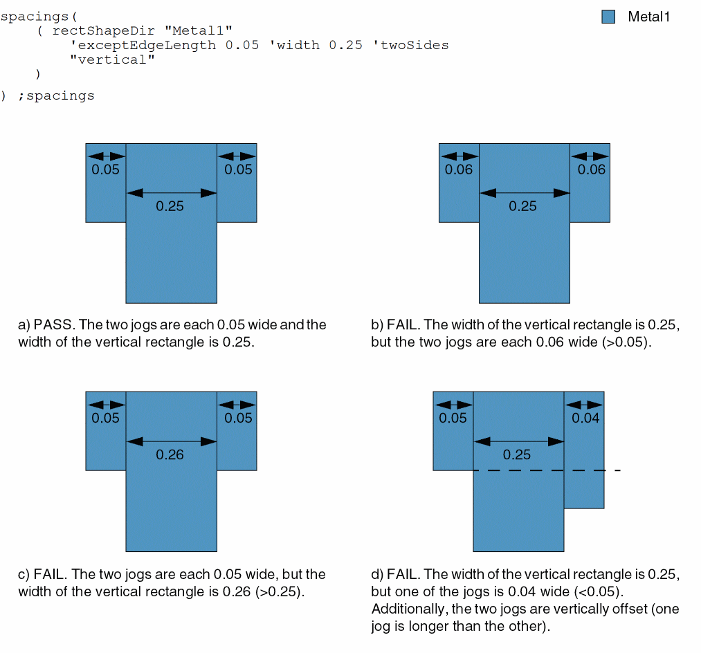 (Virtuoso Advanced Node for Layout Standard) The constraint does not apply if the rectangular shape has maxLength wide jogs on both sides. Additionally, the two jogs must not have a vertical offset. |