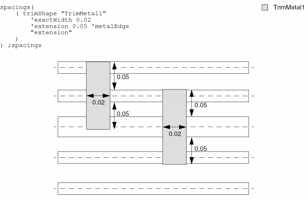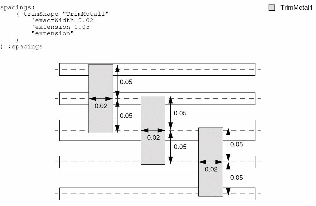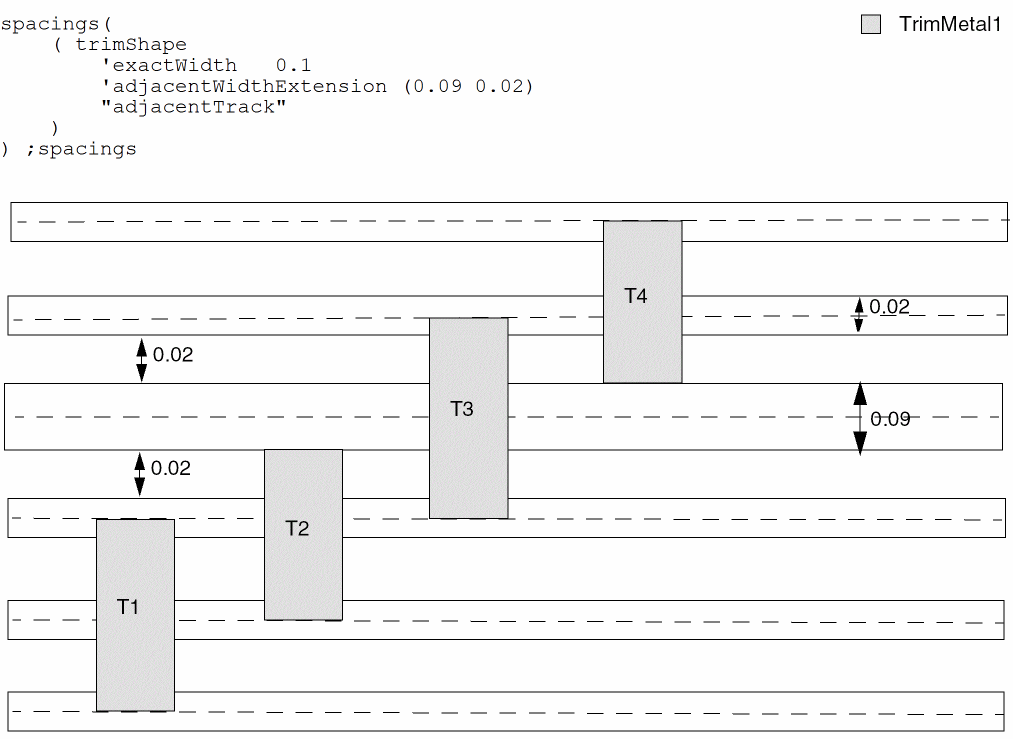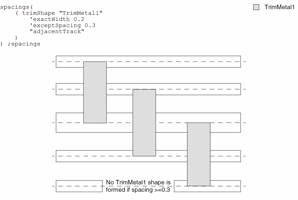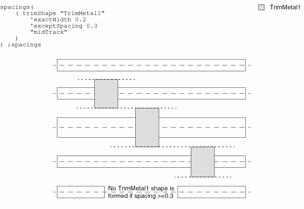 spacings( ( trimShapetx_layer'exactWidthf_exactWidth['maxLengthf_maxLength] ['exceptSpacingf_spacing] ['exceptWidthf_width] ['gapMergedg_gap] ['rowBoundaryMaxLengthf_rowBoundaryMaxLength] ['extensionf_extension['metalEdge]] ['mask1 | 'mask2 | 'mask3 | 'mask4] ['metalMask1 | 'metalMask2 | 'metalMask3 | 'metalMask4] ['insideLayers (tx_layer1tx_layer2…tx_layerN) ['insidePurposes (t_purpose1t_purpose2…t_purposeN)] | 'outsideLayers (tx_layer1tx_layer2…tx_layerN) ['outsidePurposes (t_purpose1t_purpose2…t_purposeN)] ] ['adjacentWidthExtension (f_adjWidth f_adjExtension)] ['keepoutRegion (f_offset1 f_offset2)] {"adjacentTrack" | "midTrack" | "extension"} )