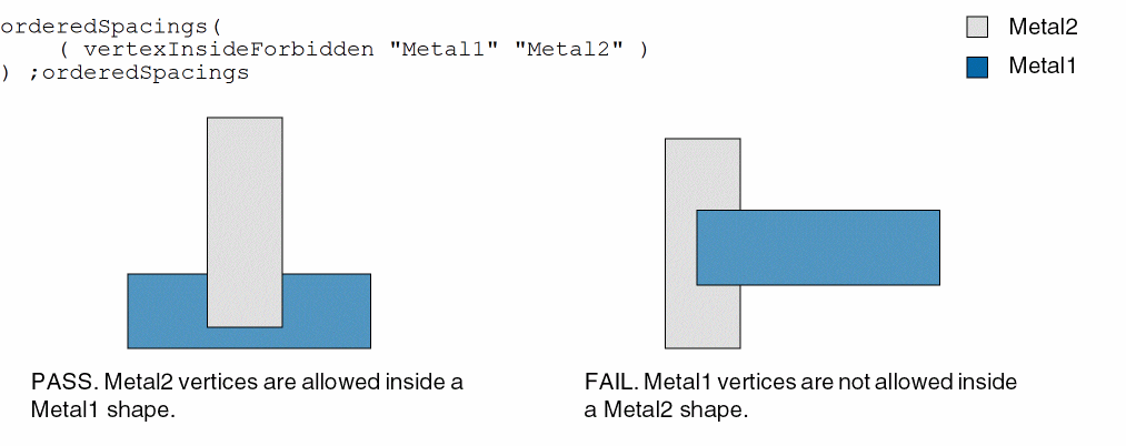 The constraint allows Metal2 vertices inside a Metal1 shape. However, Metal1 vertices are not allowed inside a Metal2 shape.
