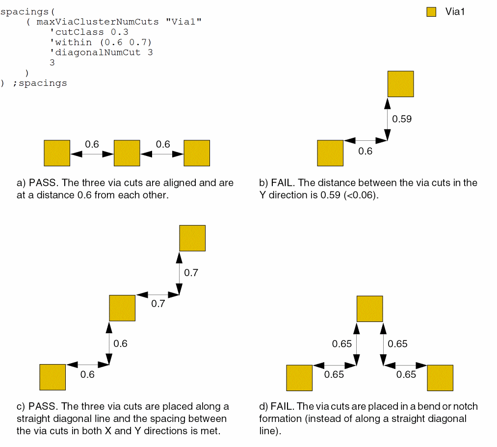 - The via cuts when placed along a straight diagonal line must be within a distance of 0.13 from each other and the spacing between them must be greater than or equal to 0.1.