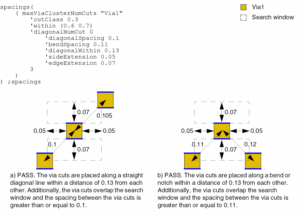 - Example 2: maxViaClusterNumCuts with cutClass, within, diagonalNumCut, diagonalSpacing, diagonalWithin, sideExtension, and edgeExtension