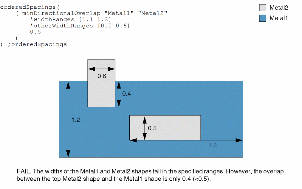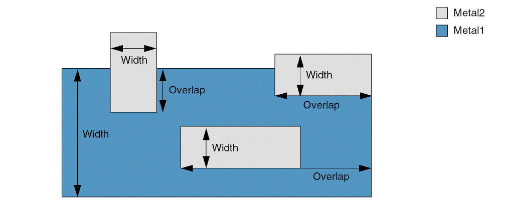 (Virtuoso Advanced Node for Layout Standard) Specifies the minimum overlap required between the shapes on layer1 and layer2. The overlap is measured in the direction of the length of the layer2 shape, between the outside edge of the layer1 shape and the innermost edge of the layer2 shape.