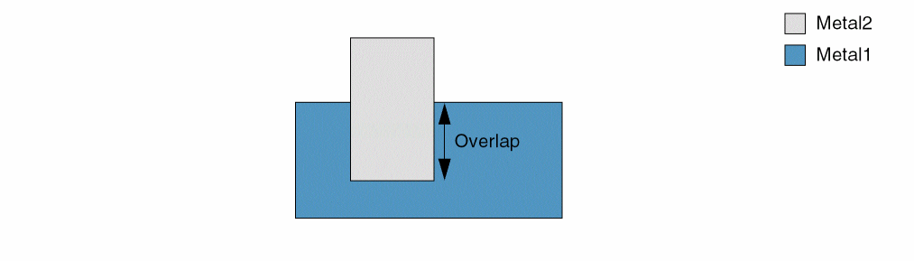 The overlap distance for Metal1 and Metal2 shapes must be at least 2.5.