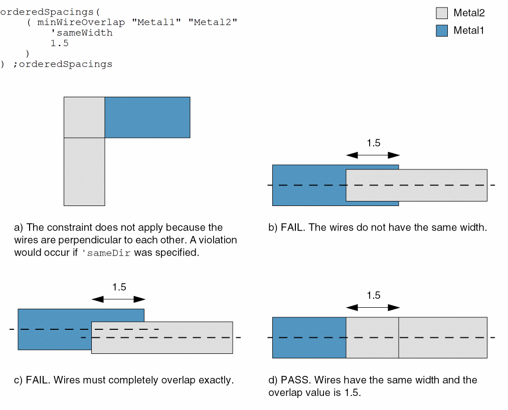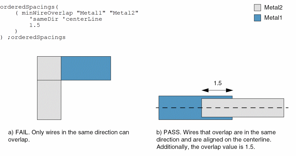 Wires on Metal1 and Metal2 can overlap only if they are in the same direction. Additionally, they must satisfy a minimum overlap value of 1.5 and must be aligned on their centerlines.