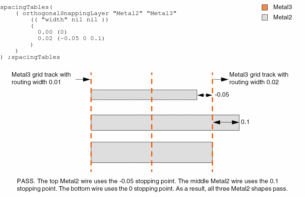 (Virtuoso Advanced Node for Layout Only) Specifies the stopping points to align end-of-line edges on layer1 with the routing grid on layer2, based on the widths of the routing tracks. The routing grid on layer2 can be specified using a number of ways, including track patterns, snapPatternDefs, and widthSpacingSnapPatternDefs. Both layers must have orthogonal direction.
