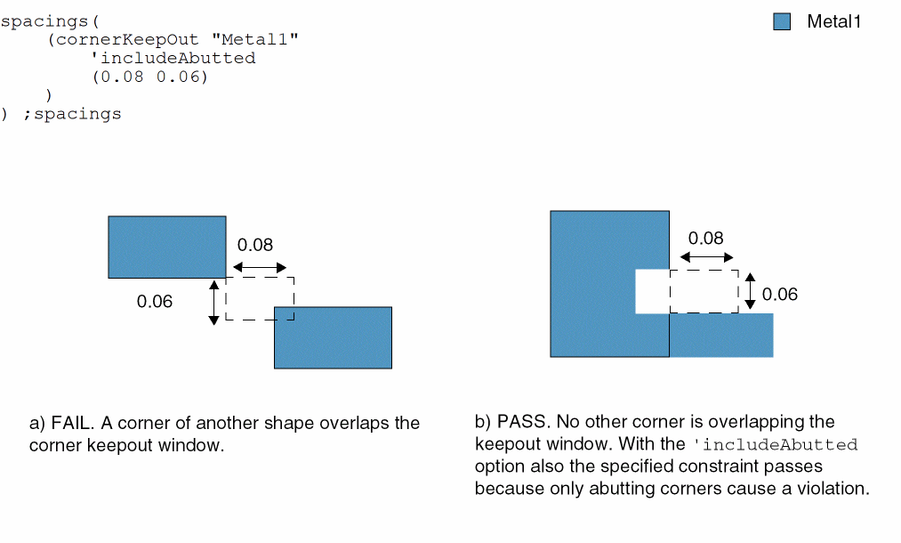 A keepout region of size 0.08 by 0.06 is created at each corner. It is a violation if a corner of another shape overlaps or touches this region.