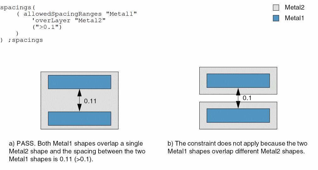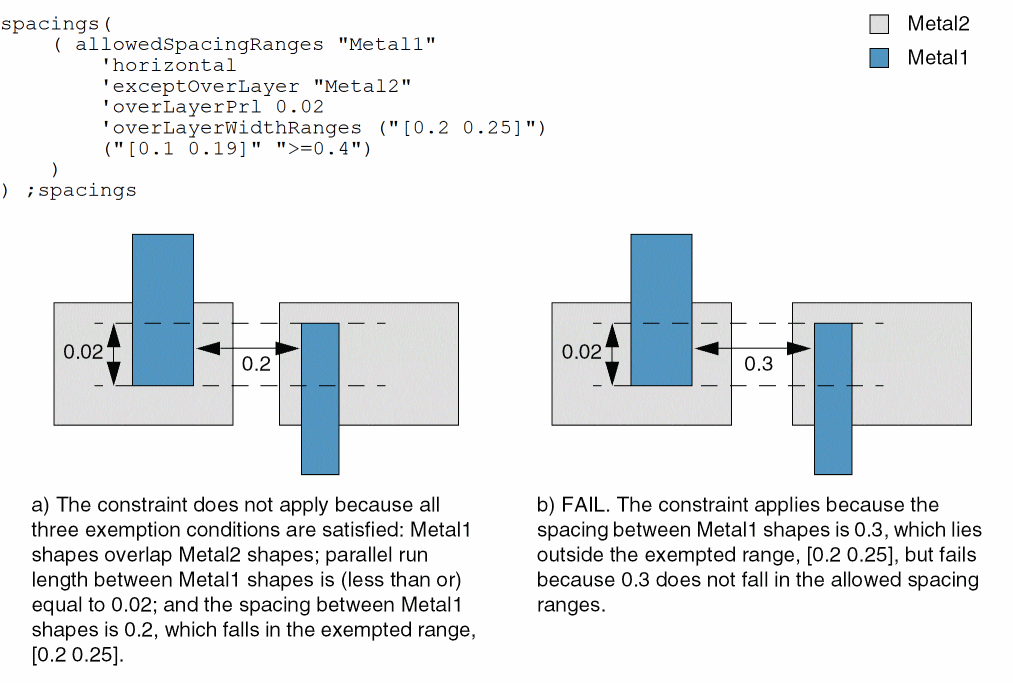 - Example 1: allowedSpacingRanges with horizontal, exceptOverLayer, overLayerPrl, and overLayerWidthRanges
