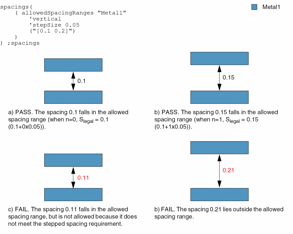 spacings( ( allowedSpacingRangestx_layer['sameMask | 'diffMask] ['mask1 | 'mask2 | 'mask3] ['exceptWidthEdge] ['widthf_width] ['jointEOLWidthRangesg_jointEOLWidthRanges] ['horizontal | 'vertical] ['widthRanges (g_widthRanges)] ['exceptOverLayertx_exceptOverLayer'overLayerPrlf_prl'overLayerWidthRanges (g_overLayerWidthRanges) ] ['exceptNumShapesg_exceptNumShapeRange'numShapeDistancef_distance'numShapeWidthRanges (g_numShapeWidthRanges) ['numShapeMaxWidthf_maxWidth] ] ['stepSizef_stepSize['stepRangeg_stepRange]] ['overLayertx_overLayer] ['insideLayers (tx_layer1 tx_layer2 … tx_layerN) ['insidePurposes (t_purpose1 t_purpose2 … t_purposeN)] | 'outsideLayers (tx_layer1 tx_layer2 … tx_layerN) ['outsidePurposes (t_purpose1 t_purpose2 … t_purposeN)] ] (g_ranges) )
