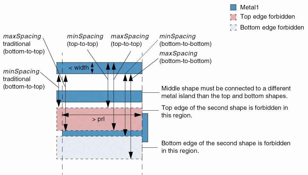 (Virtuoso Advanced Node for Layout Standard) Restricts the spacing between the left-to-left and right-to-right edges (or between top-to-top and bottom-to-bottom edges) of two shapes on a layer if a shape from a different metal island lies between the two shapes. The constraint applies only if the width of the first shape is less than the specified value.