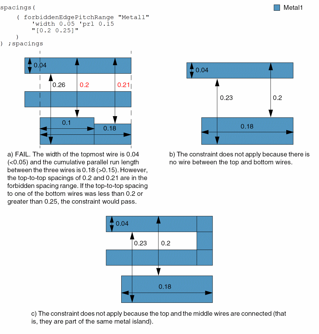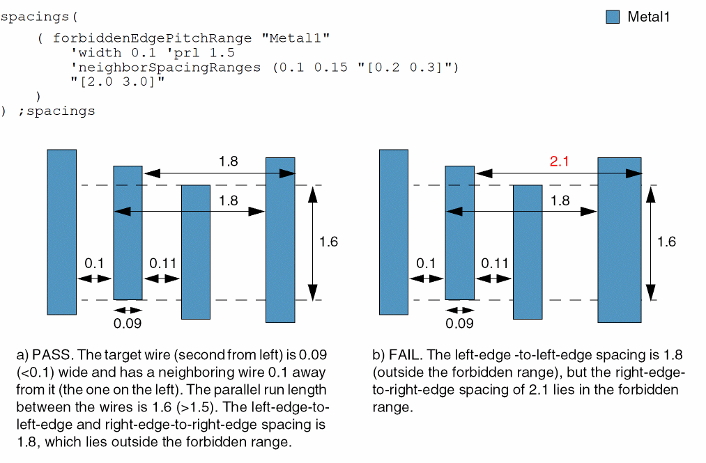 spacings( ( forbiddenEdgePitchRangetx_layer'widthf_width['prlf_prl] ['minWidthf_minWidth['outerWidthf_outerWidth] ['outerWithinf_outerWithin] ['outerSameMask] ] ['parallelWithinf_parallelWithin| 'exactSpacingNeighborf_exactSpacing['spanLengthf_spanLength['withinf_within]] | 'neighborSpacingRangesg_neighborSpacingRanges['exceptWireWidthSpacingList (g_exactWidthg_spacing)…] ['ignoreMiddleWire (g_Widthg_spacing)] ] ['secondForbiddenRangeg_secondForbiddenRange] ['sameMask | 'mask1 | 'mask2 | 'mask3] ['exactWireWidth] ['otherWidthf_otherWidth] (g_range) )