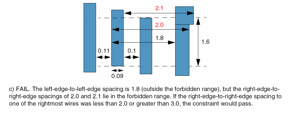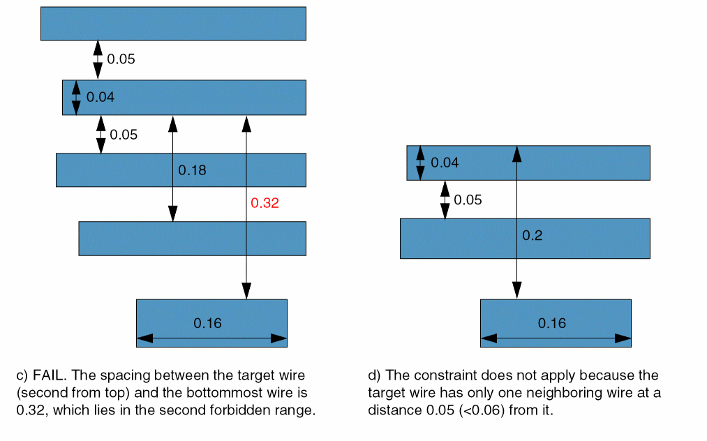 - The Metal1 wire under consideration has width less than 0.05 and has neighboring wires on both sides at a distance less than 0.06 from it.