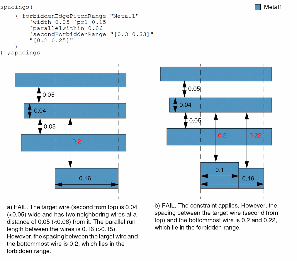 - Example 2: forbiddenEdgePitchRange with width, prl, and neighborSpacingRanges