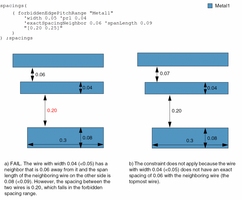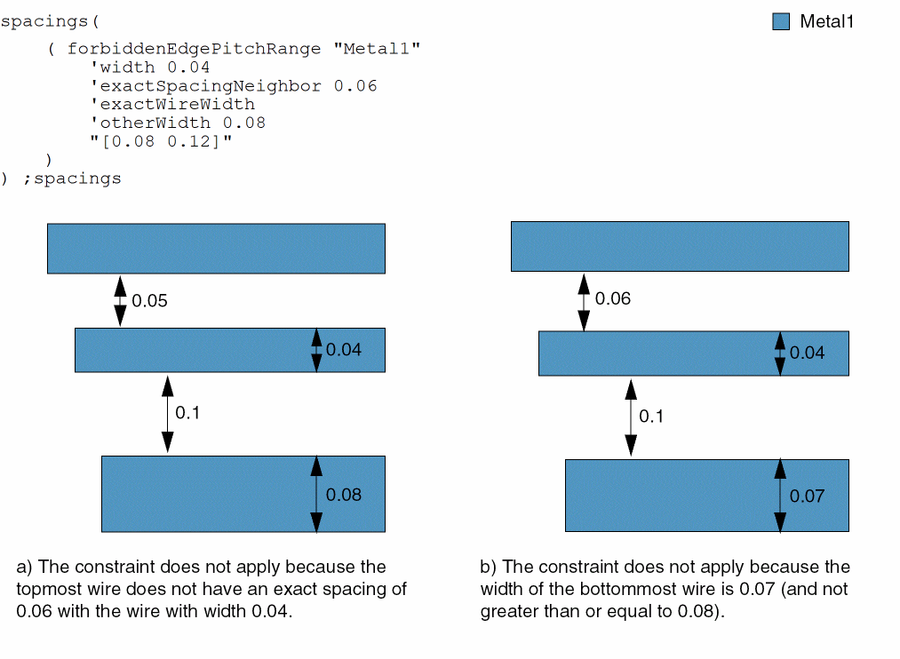 - Example 5: forbiddenEdgePitchRange with width, exactSpacingNeighbor, exactWireWidth, and otherWidth