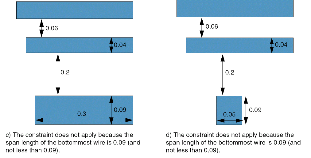 - The second wire has span length less than 0.09 and has a neighboring wire at a distance less than 0.15 from it.