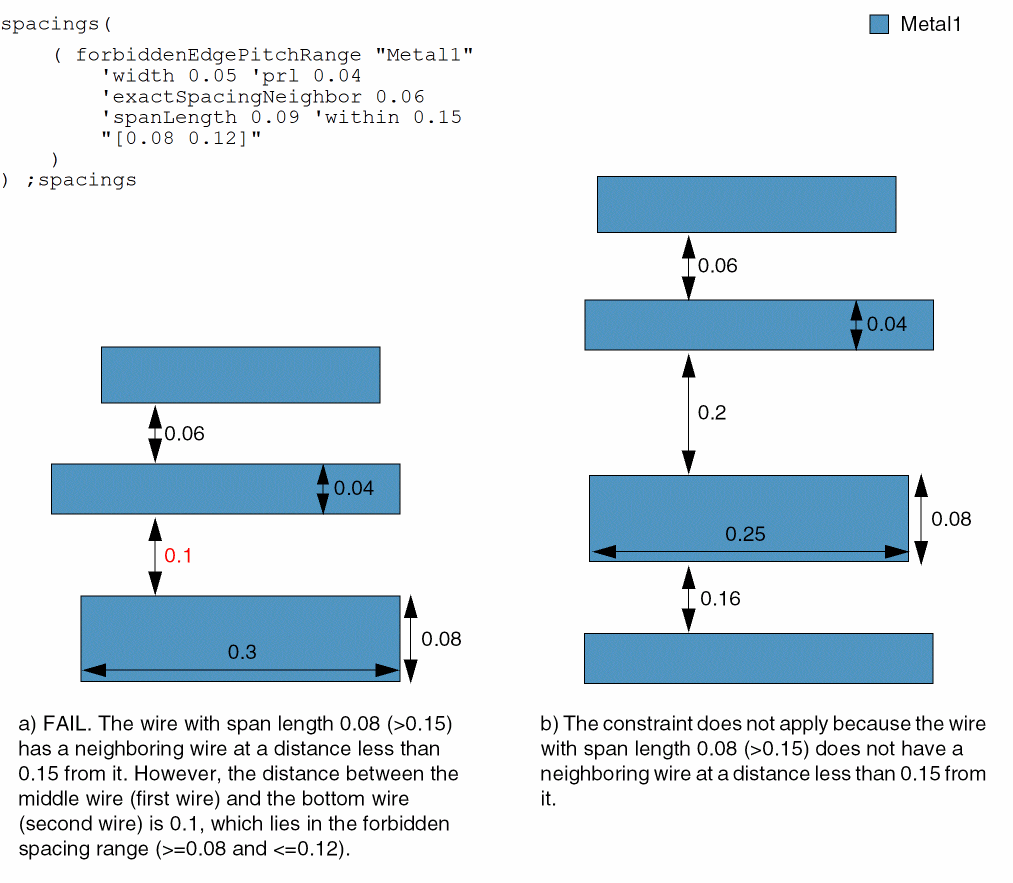 - Example 4: forbiddenEdgePitchRange with width, prl, exactSpacingNeighbor, and spanLength